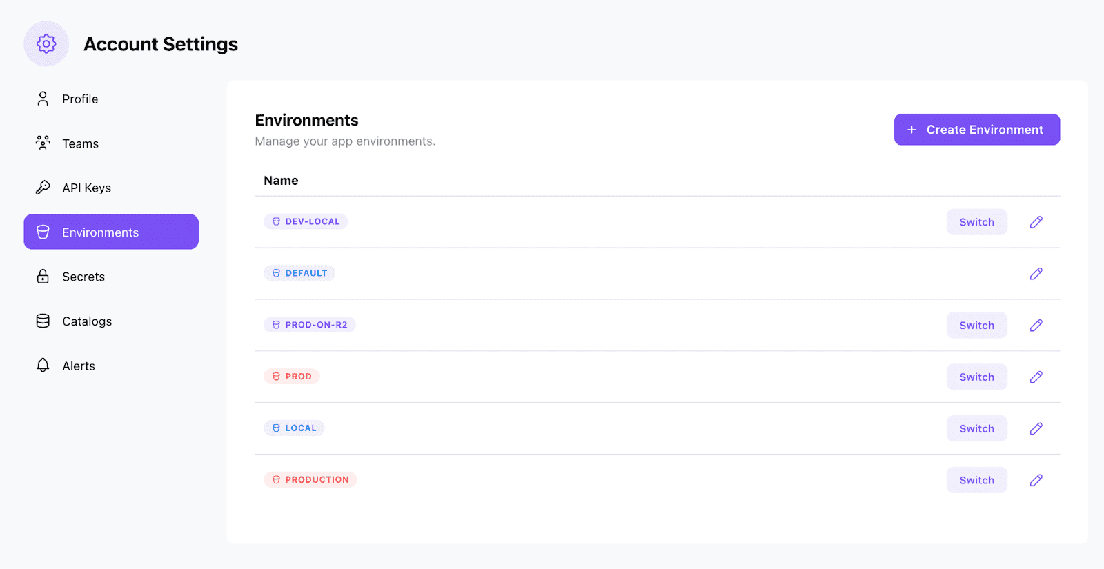 We are working on an easier way to support hierarchies of environments. Right now we only have a 2-level hierarchy, where every environment inherits secrets and settings from the “default” environment. We want to make it easier to support multi-level hierarchies, where, for example, you can have a base “development” environment, and all your developers can override settings in their personal development environment.