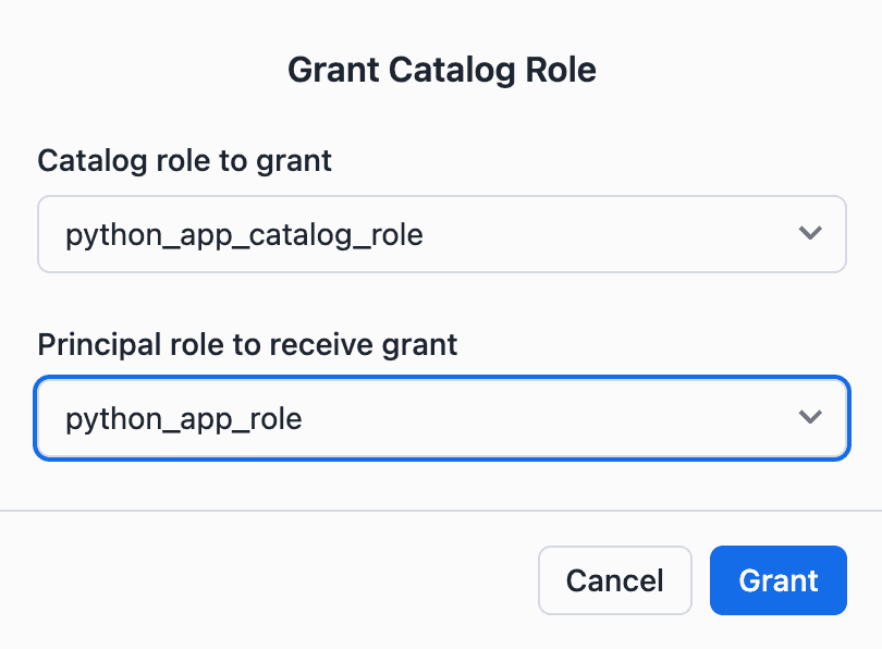 Then, you click on "Grant to Principal Role" and tell Open Catalog which principal role should be granted that catalog role.