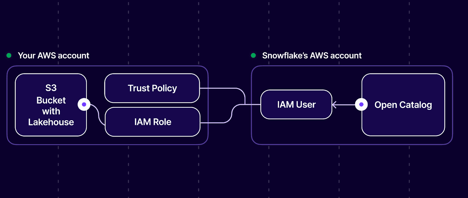 4. Open Catalog will create a new IAM User (in their own AWS account, not in your account!). You will then establish a Trust Policy allowing this Snowflake user to assume the role you created in your account ("peach_lake_open_catalog_role") and, therefore, access objects in your S3 bucket.