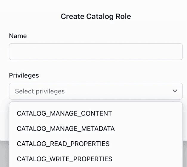 The granularity of privileges can be on the level of the entire catalog, a namespace in the catalog, and a table in a namespace.