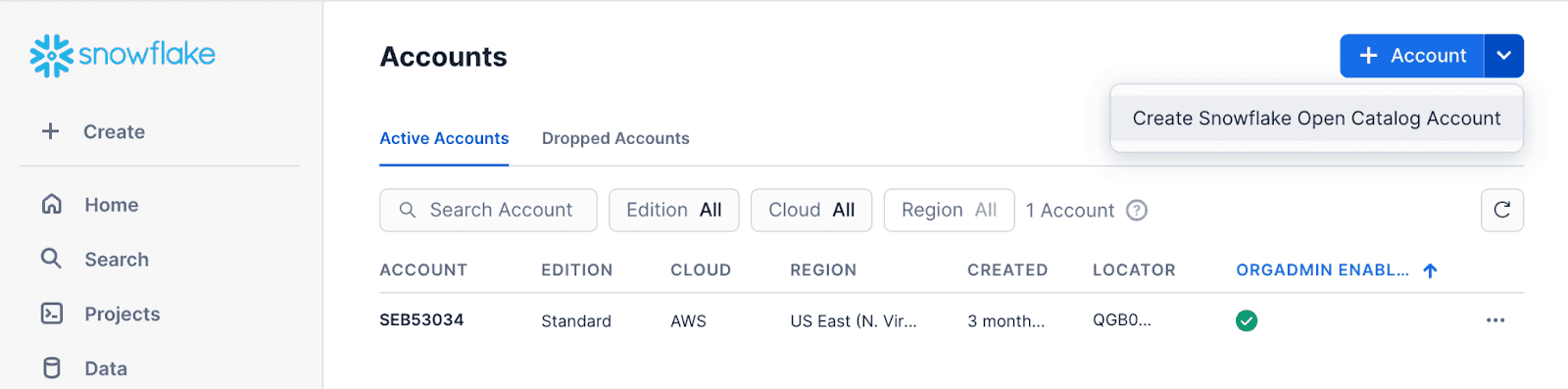 First, create a new account with the Snowflake Open Catalog managed service by following this guide. The UI of Open Catalog looks suspiciously similar to a regular Snowflake UI, except that you don't see any of the data warehouse functionality.