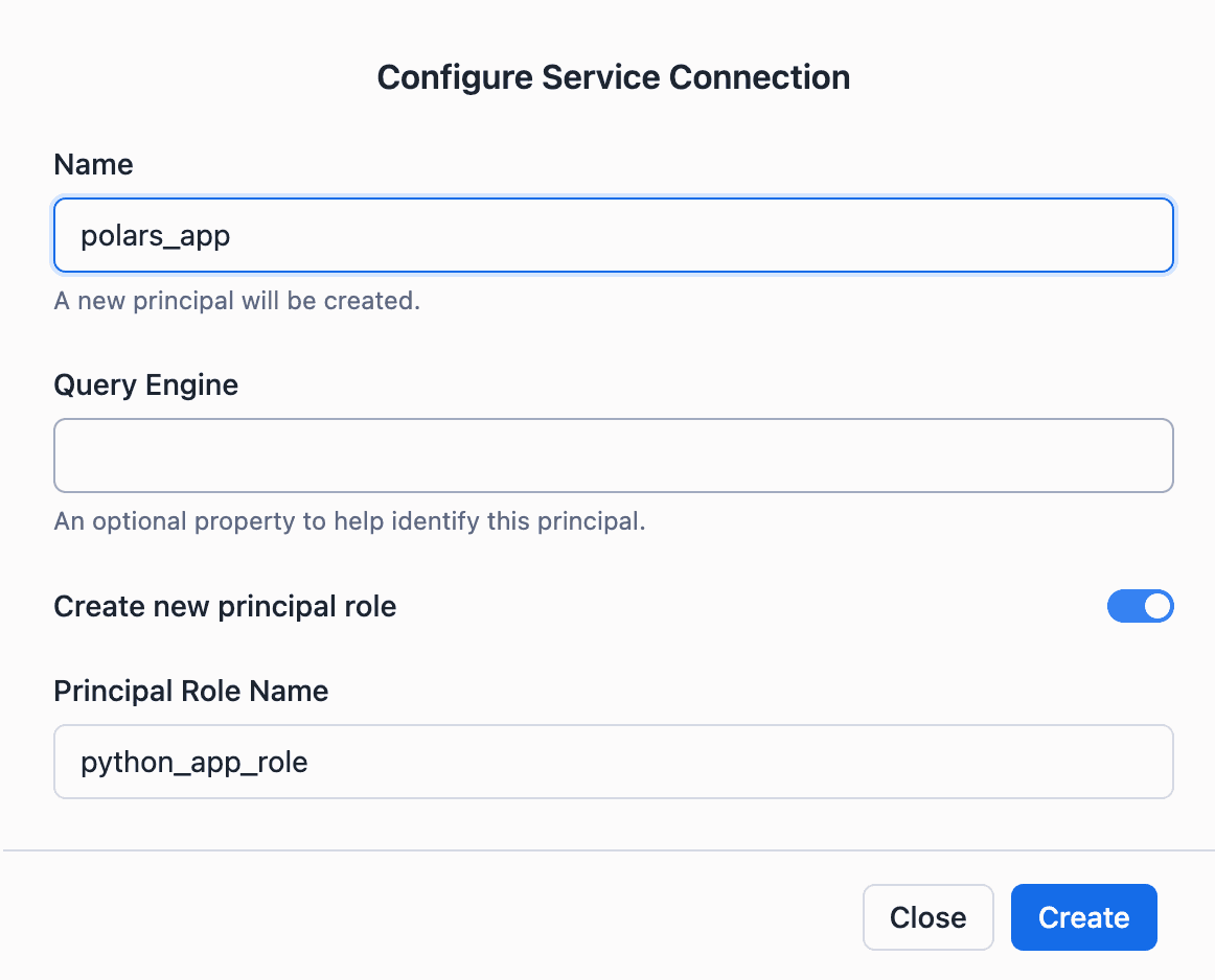 At this point, you will also get the chance to save the ID and the Secret of the Service Principal. You will use them as credentials in your data app to access the Iceberg catalog.