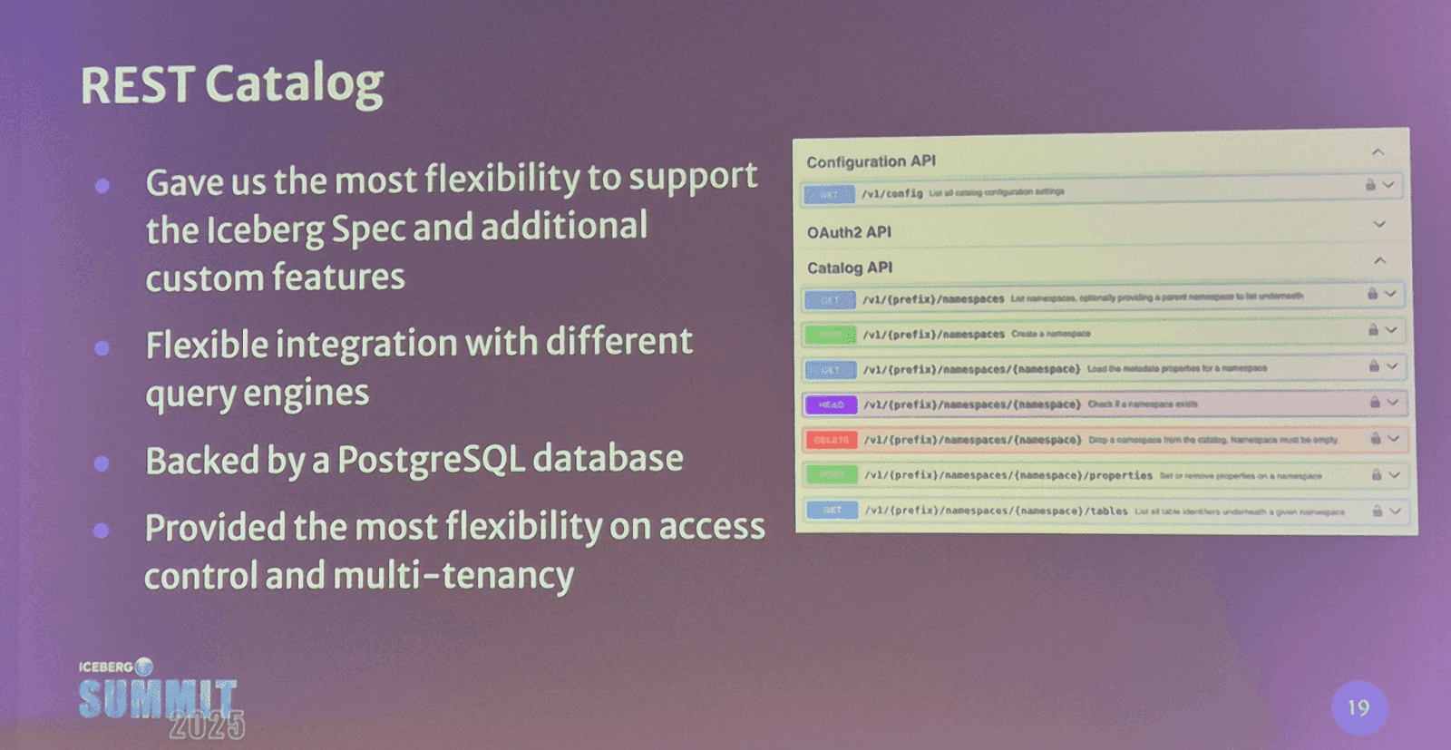 Several users built their own REST-based catalogs backed by Postgres. They did not use the Polaris, Lakekeeper, or Gravitino catalogs that emerged last year. This could be due to the lack of readiness of catalog projects or due to catalog decisions made before the REST standard became widely accepted:
