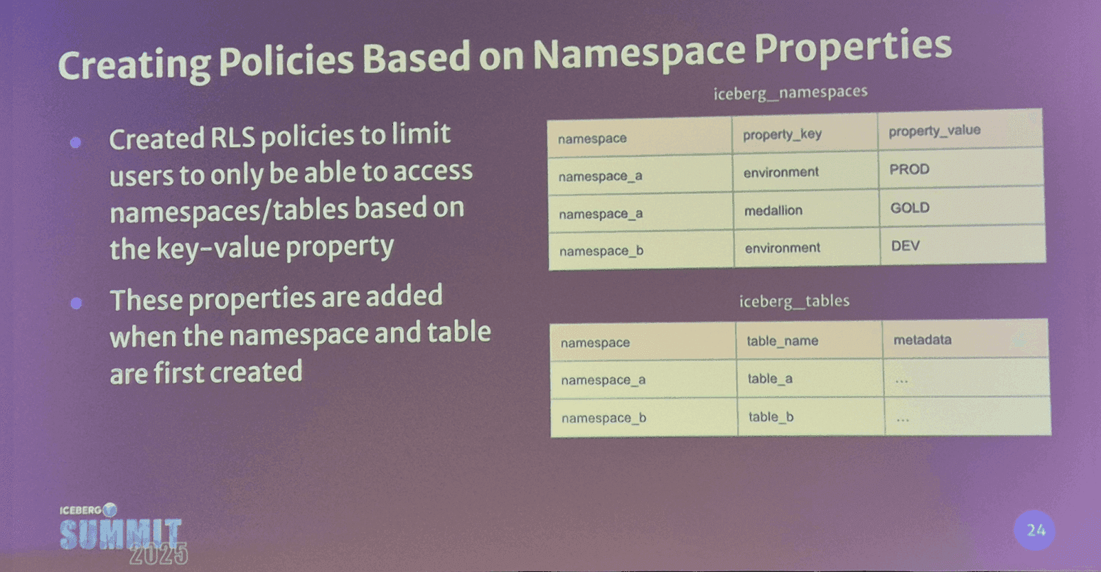 Bloomberg implemented access control at the table level in their custom-made REST catalog via metadata tags (e.g., users only get a list of tables that they have access to).