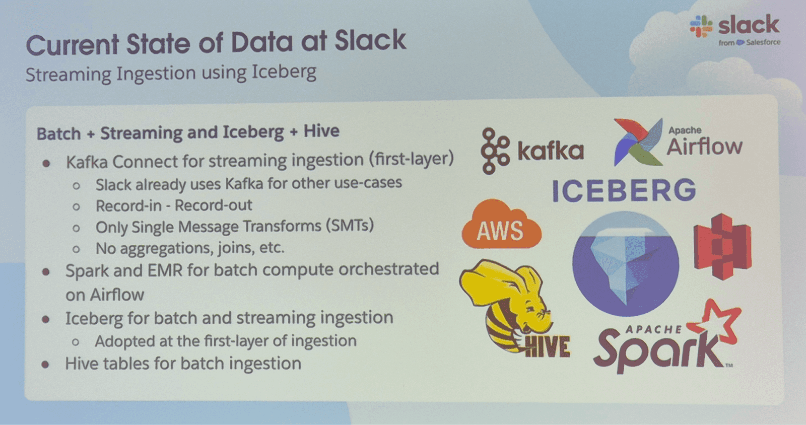 Slack: Uses Kafka Connect; suffers from orphan file bloat due to many writers and frequent commits.