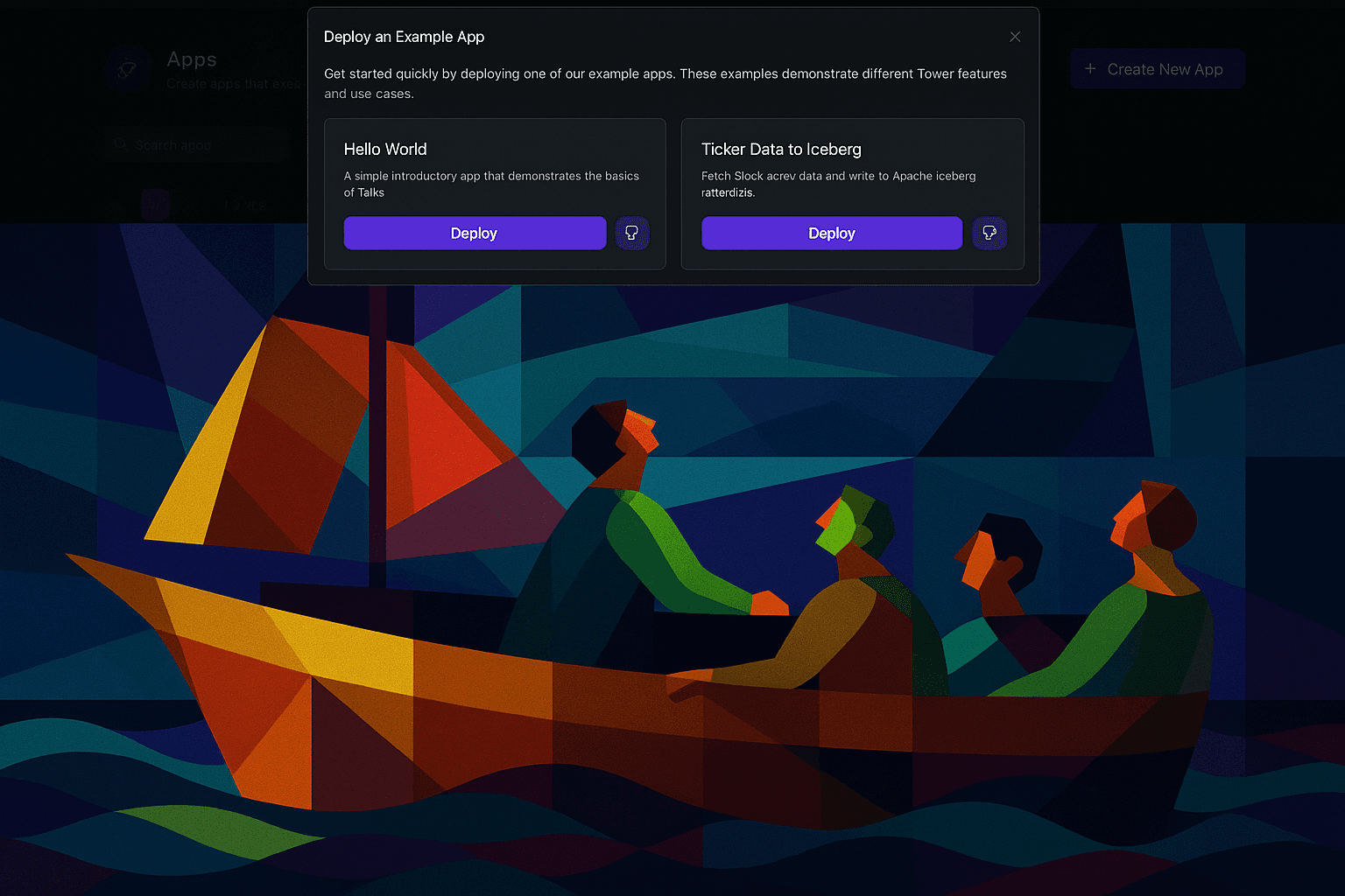 In addition to simple “Hello-World” apps, you can now also deploy a more advanced Stock Ticker data acquisition app that works with Iceberg tables. Soon, we’ll make the rest of our example apps deployable as well. If you pick an app that uses an Iceberg lakehouse, we’ll also set up a default Tower Catalog and provide storage in a temporary S3 bucket, so the example runs right away.