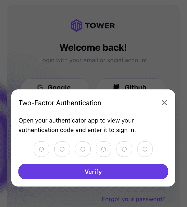 MFA provides a second "factor" in addition to regular Tower passwords or social logins to be used by Tower to authenticate the user during every login. This helps protect user accounts even if their regular Tower passwords are compromised.