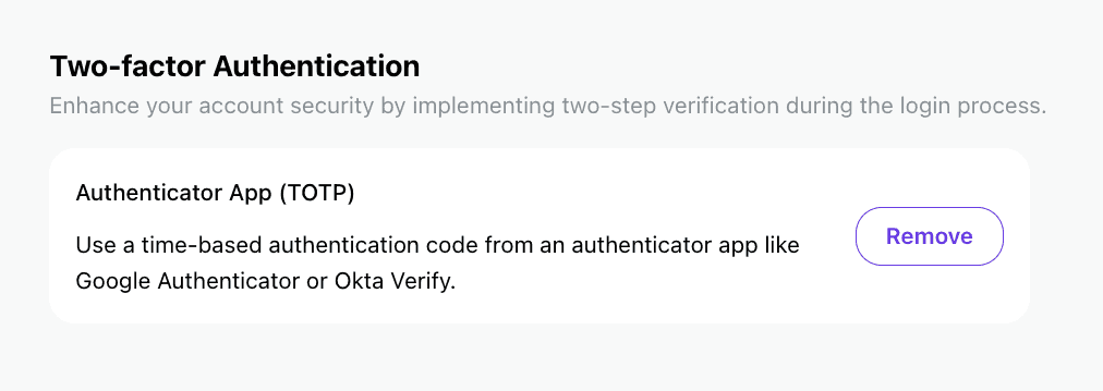 To remove MFA and revert to single-factor authentication (password or social login), click 'Remove'.